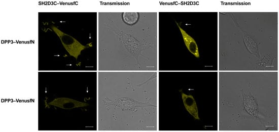 2.3. EGFP-DPP3 and SH2D3C-mCherry Colocalize in Cytosol, Nucleus, and Membrane Ruffles
