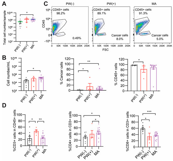Cancer cell percentage and T cell subsets in ex vivo cells from GCPM patients. Patients were divided into three groups: peritoneal washing (PW(−)), peritoneal washing with malignant metastasis using cytology (PW(+), early stage metastasis), and malignant ascites (MA, late-stage metastasis). (A). Total cell numbers. (B). Cell number/mL. (C). Percentage of leukocytes and cancer cells. CD45+ cells are leukocytes, and CD45−/large-size cells were considered cancer cells. (D). Percentage of CD3+, CD3+CD4+, and CD3+CD8+ T cells. Mean ± SEM. * p < 0.05, ** p < 0.01, *** p < 0.001. Black: PW(−), Red: PW(+), Purple: MA. PW(−): peritoneal washing (cytology negative); PW(+): peritoneal washing (cytology positive); MA: malignant ascites.