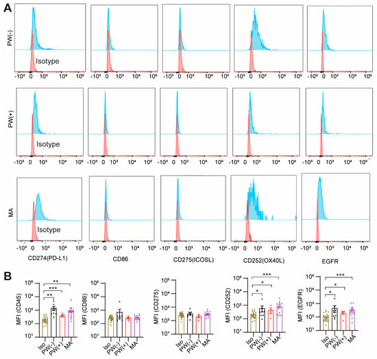 We observed that the immune checkpoint inhibitor, PD-L1 (CD274), a ligand for T cell surface receptor PD-1, was expressed on the cancer cell surface of PW(+) and MA groups similar to the PW(−) group, compared to isotype control (p < 0.001, p < 0.01, or p < 0.01, respectively). There was no significant difference in PD-L1 expression between the PW(−) and MA groups. CD86, a ligand of T cell surface receptor CTLA4, was not expressed on cancer cells (Figure 2A,B). Interestingly, CD252 (OX40L), the ligand of OX40, a T cell activation marker, was expressed on cancer cells of the PW(+) and MA groups similar to the PW(−) group (p < 0.05, p < 0.001, p < 0.05, respectively). CD275 (ICOSL), the ligand of ICOS, also a T cell activation marker, was not expressed on cancer cells (Figure 2A,B). The epithelial growth factor receptor (EGFR) was significantly higher expressed on cancer cells of the PW(+) and MA groups similar to the PW(−) group (p < 0.05, p < 0.001, p < 0.05, respectively, Figure 2A,B) with no significant difference among the three groups. These results suggest that GC cells in the peritoneum are positive for CD274, CD252, and EGFR.