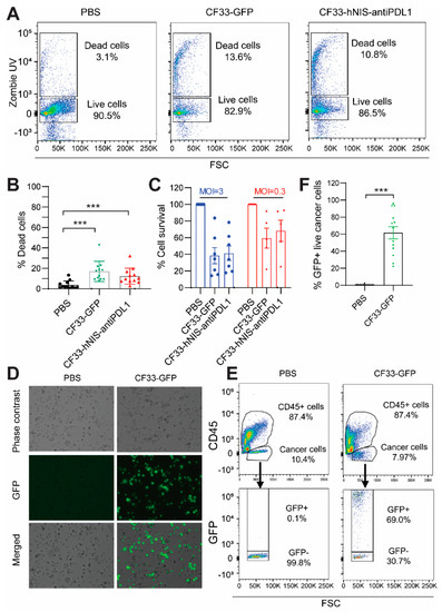 Cytotoxicity and infection of ex vivo cells treated with CF33-GFP or CF33-hNIS-antiPDL1. (A,B). Ex vivo cells (2.5 × 106/mL) were treated with PBS, CF33-GFP (MOI = 3), or CF33-hNIS-antiPDL1 (MOI = 3) for 15 h, harvested, stained with Zombie UV for dead cells, and analyzed using flow cytometry for (A) representatives and (B) statistical analysis. (C) Ex vivo cells (1 × 105 cells/well in 96-well plate) were treated with PBS, CF33-GFP, or CF33-hNIS-antiPDL1 for 48 h, and examined for cytotoxicity. Percent survival was calculated relative to PBS-infected wells. (D–F). Ex vivo cells (2.5 × 106 cells/mL) were treated with PBS or CF33-GFP (MOI = 3) for 15 h, then imaged using fluorescence microscopy to observe CF33-GFP replication (D) and harvested and analyzed using flow cytometry for GFP expression of live cancer cells (E), representatives with statistical analysis (F) (Mean ± SEM). *** p <0.001. MOI: multiplicity of infection; GFP: green fluorescent protein.