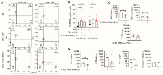 CF33-hNIS-antiPDL1 induced CD107α expression in ex vivo CD4+ and CD8+ T cells and decreased growth factor release. Ex vivo cells (2.5 × 106 cells/mL) were treated with PBS, CF33-GFP (MOI = 3), or CF33-hNIS-antiPDL1 (MOI = 3) for 15 h, then harvested, stained with antibodies, and analyzed using flow cytometry. (A) One representative to show CD107α expression as dot blot analysis. (B) Statistical analysis of CD8+CD107α+ T cell and CD4+CD107α+ T cell percentage. (C,D) Ex vivo cells (2.5 × 106 cells/mL) were treated with PBS or CF33-hNIS-antiPDL1 (MOI = 3) for 15 h, then supernatants were harvested and analyzed using Cytokine Multiplex Analysis Kit for growth factors (C) and soluble PD-L1/cytokines (D) (unit: pg/mL, n = 3, Mean ± SEM). * p < 0.05, ** p < 0.01, *** p < 0.001.
