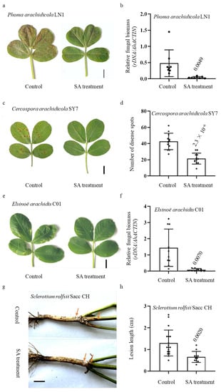 It is often reported that SA promotes resistance against both local defense response and SAR [32]. Hence, the basal stem of SA-treated and control plants was inoculated with S. rolfsii Sacc CH, a virulent peanut stem rot strain, to investigate its important role in peanut SAR. We observed that the lesion lengths of SA-treated plants were significantly shorter than the control ones (Figure 1g,h). These results collectively indicate that peanut resistance to multiple pathogens was induced by exogenous SA treatment.
