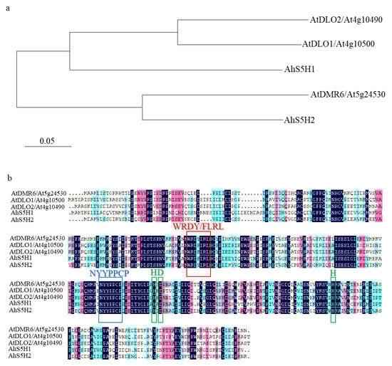 Based on conserved domains of the conserved 2-oxoglutarate-dependent dioxygenases, we used the protein sequences of Arabidopsis S3H and S5H to blast the NCBI database (https://www.ncbi.nlm.nih.gov/ accessed on 22 January 2022). As shown in Figure 2a, two homologs were identified in peanut and named AhS5H1 (XP_025631840), AhS5H2 (XP_025683565). AhS5H1 displayed high similarity to Arabidopsis S3H and its close homolog DLO2 [25,26] due to the phylogenetic analysis, and AhS5H2 was similar to S5H [27].