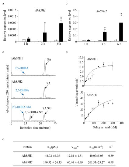 Identification of the salicylic acid 5-hydroxylases in vitro. Expression levels of AhS5H1 and AhS5H2 in peanuts after SA treatment (a,b). Three-week-old seedlings were treated with 1 mM SA in 5 mM MES buffer for 1 h, 3 h and 6 h. For the mock treatment, the seedlings received the same volume of DMSO solvent. Gene expression was determined by qRT-PCR using AhACTIN as the reference gene. Values are means ± SD (n = 3). Asterisks indicate statistically significant differences compared with the corresponding mock using Student’s t-test (*, p < 0.05; **, p < 0.01). (c) HPLC profiles of the 30 min reaction of the recombinant AhS5H1 and AhS5H2 proteins on the SA substrate. Authentic 2,5-dihydroxyl benzoic acid (2,5-DHBA) was used as a standard. Kinetics curves (d) and kinetic parameters (e). * nmol/mg protein/min. Km for Michaelis constant, Vmax for maximum reaction rates, Kcat for catalytic rate constant. Kinetic parameters and curves were obtained from the reactions at pH 6.8 and 40 °C for 30 min. The data are presented as means ± SD (n = 3).