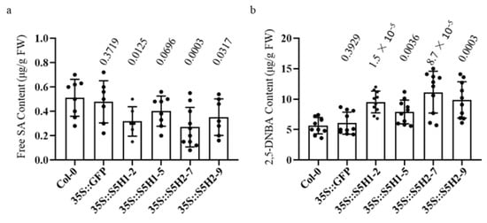 The expression of AhS5H1 and AhS5H2 was observed to be significantly enhanced in their respective lines that were subjected to overexpression, as depicted in Figure S1. The levels of SA, serving as the substrate for AhS5H1 and AhS5H2, exhibited a significant decrease in comparison to control and wild-type (Col-0) plants at 40 DAG (days after germination) (Figure 4a). Simultaneously, there was a significant enhancement in the production of 2,5-dihydroxybenzoic acid (2,5-DHBA) (Figure 4b). The results indicated that both AhS5H1 and AhS5H2 exhibit hydroxylase activity in plants.