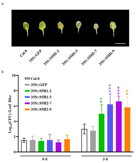 We also assessed the pathogen resistance of WT, control (35S::GFP), AhS5H1 overexpression lines (35S::S5H1-2 and 35S::S5H1-5) and AhS5H2 overexpression lines (35S::S5H2-7 and 35S::S5H2-9). The transgenic and wild-type plants were inoculated with Pst DC3000, a common bacterial pathogen, by foliar spraying of a bacterial suspension on three-week-old plants. All the AhS5H1 and AhS5H2 overexpression lines displayed enhanced susceptibility to Pst DC3000 compared to the WT or control lines. (Figure 5a,b), which is consistent with the phenotypes of the DMR6 overexpression lines [25,27].