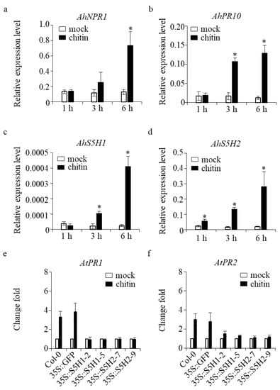 To gain more information, a set of defense-related genes, such as AtPR1 and AtPR2 [34], were subjected to qRT-PCR analysis using six biological replicates for validation. Expression levels were quantified in the wild-type (WT) samples, control (35S::GFP) samples, as well as the overexpression lines of AhS5H1 (35S::S5H1-2 and 35S::S5H1-5) and AhS5H2 (35S::S5H2-7 and 35S::S5H2-9). Both tested genes exhibited clear induction in response to chitin stimulation in both wild-type (WT) and control plant samples, when compared to the overexpression lines (Figure 6e,f). The integrated dataset revealed that the expression of AhS5H1 and AhS5H2 genes exhibited alterations in the response to defense mechanisms.