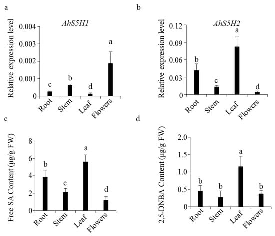 Expression of AhS5Hs and accumulation of SA and 2,5-DHBA. AhS5H1 (a) and AhS5H2 (b) expression in different tissues of peanut. Roots, leaves, stems and flowers were collected from plants grown in the paddy field at stage of flowering. Transcript level was determined by qRT-PCR using AhACTIN as the reference gene. The accumulation of SA (c) and 2,5-DHBA (d). Values are means ± SD (n = 3). Columns marked with different letters (a–d) indicate significant differences, as analyzed by the SPSS software version 22.0 (Duncan’s multiple range test, α = 0.05).