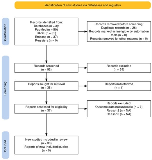 The systematic search on search engines PubMed, Embase, and BASE for scientific literature reporting NF-κB’s role in aneurysm biology delivered a total of 118 records. After deduplication and title screening, 92 unique research articles were left. The abstract screening delivered 38 research articles for full-text screening. The full-text screening delivered 30 scientific research articles. The flowchart for the systematic search is shown in Figure 1. Eight research articles reported findings on human samples, and 25 studies reported NF-κB findings using animal models. Three studies reported both experimental and clinical data.