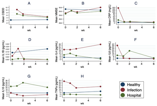 A summary of CSDD and MMSE values and proportion of participants with abnormal values are presented in Supplementary Materials Tables S1 and S2. All individuals from the healthy and hospital control group presented with a normal MMSE (a score higher than 24 throughout the study) and the vast majority of them had a normal CSDD in all weeks. On the other hand, although all participants in the infection group had a normal MMSE at all data collection points, 50% of them (n = 6) had an abnormal CSDD (Mean = 10.33, SD = 7.09) in week 1. This improved in week 2 as only two individuals had an abnormal value of 12 or above (Mean = 6.92; SD = 5) and in week 6, when all the participants in this group except one had a normal CSDD score (Mean = 4.80, SD = 4.47) (Tables S1 and S2). Both the CSDD and the MMSE were significantly different in week 0 between the groups (p = 0.0001 and p = 0.036, respectively). Moreover, as it can be seen in Table 2, both the CSDD and the MMSE changes between groups were also statistically significantly different (p = 0.001 and p = 0.033, respectively) and the CSDD score changed significantly in the infection group from week 1 to 6 (p = 0.008) (Table 2). No statistically significant difference in MMSE and the CSDD scores between the groups in week 6 was found, suggesting that all these scores went back to normal after recovery.