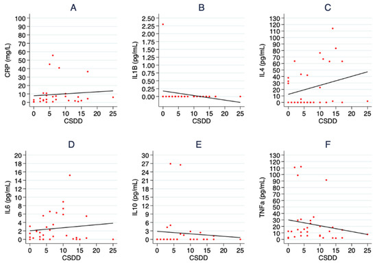 Correlations between inflammatory markers and depressive state in the infection group. In (A) the association between CRP and the CSDD is shown, in (B,D,F) the same correlation is displayed for the proinflammatory cytokines (IL1, IL6 and TNFα) and in (C,E) the association between anti-inflammatory cytokines (Il4 and Il10) and the CSDD for the participants in the infection group is shown.