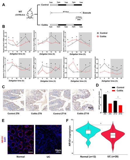 Colitis was induced in mice using DSS, simulating the conditions observed in human inflammatory bowel diseases, inclusive of ulcerative colitis [32] (Figure 2A). Compared to the control group (CG), colitis altered most genes’ temporal expression patterns (Figure 2B). Notably, NR1D1 expression was also reduced at all six time points. This result was confirmed by immunohistochemistry (Figure 2C,D).
