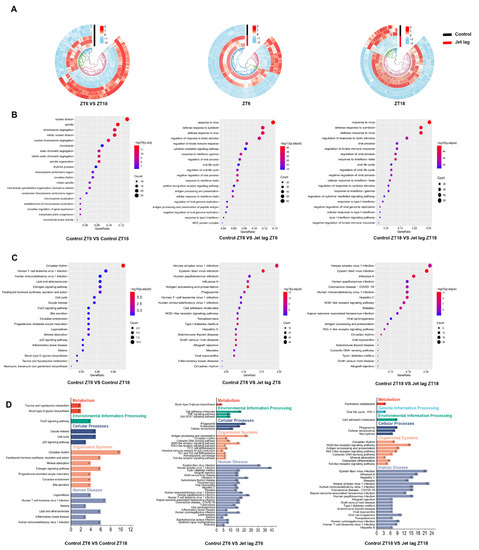 Jet lag disrupts immune homeostasis in IECs. (A) Heat maps exhibiting differentially expressed genes (DEGs) between zeitgeber times (ZTs) 6 and 18 within the control group (CG) (left panel) and between the CG and the jet lag group at both ZT6 and ZT18 (right panels). (B) Gene Ontology (GO) enrichment analysis depicting DEGs in the CG across ZT6 and ZT18 (left panel) and those between the CG and jet lag group at both ZT6 and ZT18 (right panels). (C) Kyoto Encyclopedia of Genes and Genomes (KEGG) pathway enrichment analysis showing DEGs in the CG between ZT6 and ZT18 (left panel) and those between the CG and jet lag group at ZT6 and ZT18 (right panels). (D) Classification and distribution of enriched KEGG pathways. Experimental replicates n = 3.