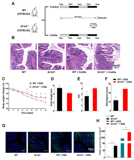 Nr1d1 deletion intensifies colitis severity. (A) Schematic representation of the colitis mouse model. (B) Hematoxylin and eosin staining of the colon from wild-type and Nr1d1−/− mice subjected to colitis, scale bar = 50 μm. (C) Body weight dynamics of the groups. (D–F) Comparative assessments of colon length, disease activity index scores, and histological scores between the experimental cohorts. (G,H) Quantitative analysis of TUNEL-positive cells in colonic samples derived from wild-type and Nr1d1−/− mice, with and without colitis induction, scale bar = 20 μm. Data points are expressed as means ± standard deviations (n = 3–6). * p < 0.05 (Student’s t-test).