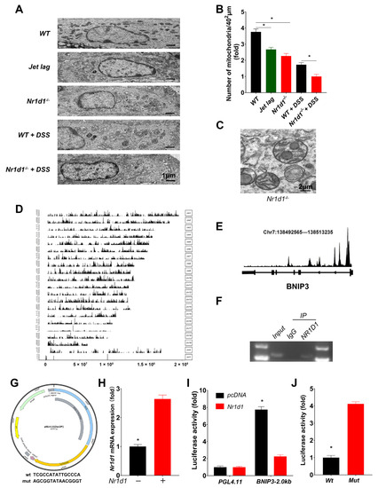 NR1D1 promotes BNIP3 transcription. (A) Representative transmission electron microscopy (TEM) images showcasing mitochondrial structures in IECs derived from wild-type (WT) and Nr1d1−/− mice from a jet lag model, as well as WT and Nr1d1−/− mice treated with DSS, with a scale bar representing 1 μm. (B) Quantification of damaged mitochondria per field of view. (C) Representative image of mitochondrial diameter, scale bar = 2 μm. (D) ChIP-seq signal peak distributions across chromosomes using an anti-NR1D1 antibody, with the X-axis signifying chromosomal length and the Y-axis indicating signal peak frequency along the chromosome. (E) BNIP3 locus depiction using the Peak Browser tool. (F) Agarose gel electrophoresis of ChIP-PCR products. (G) Schematic representation of the reporter plasmid (mut: mutation in the BNIP3 promoter region at the NR1D1 binding site). (H) Quantitative real-time PCR analysis of Nr1d1 mRNA expression in CCD 841 CoN cells post Nr1d1 overexpression plasmid transfection. (I,J) Evaluation of luciferase activity in CCD 841 CoN cells using dual-luciferase reporter assays. Data are displayed as means ± standard deviations (n = 3). * p < 0.05 (Student’s t-test and one-way analysis of variance).