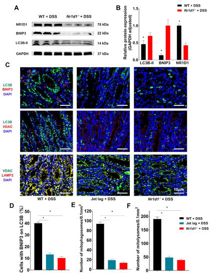 Immunohistochemistry was performed using the anti-NR1D1 antibody [#13418S] (Cell Signaling Technology; Danvers, MA, USA). Immunofluorescence was performed using antibodies against LC3B [#L7543] (Sigma-Aldrich; St. Louis, MI, USA), BNIP3 [#sc-56167] (Santa Cruz; Santa Cruz, CA, USA), Lamp2 [#ab125068], and VDAC [#ab14734] (Abcam; Cambridge, UK). Apoptosis in colonic tissues was detected via terminal deoxynucleotidyl transferase-mediated dUTP nick-end labeling (TUNEL) (Beyotime; Shanghai, China).