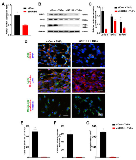 Intriguingly, following NR1D1 knockdown (KD) and subsequent TNFα stimulation, we observed a marked decrease in the levels of BNIP3 and LC3B-II proteins (Figure 7B,C). Moreover, this TNFα-induced stimulation in the context of NR1D1 KD resulted in a diminished colocalization of LC3B-II with BNIP3, LC3B-II with MitoTracker, and MitoTracker with LysoTracker, compared to the CG (Figure 7D). These results suggest that TNFα stimulation in NR1D1-depleted cells leads to both enhanced mitochondrial damage and impaired mitophagy. Furthermore, upon NR1D1 KD and TNFα stimulation, we observed a significant reduction in the formation of mitophagosomes and mitolysosomes (Figure 7E–G). Collectively, these findings strongly suggest that depletion of NR1D1, particularly when cells are stimulated with TNFα, impairs mitophagy, potentially due to a decrease in BNIP3 expression.