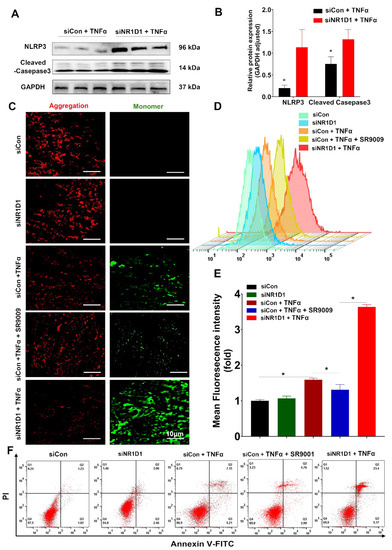 In NR1D1 KD cells, we observed an exacerbated expression of NLRP3 and cleaved caspase-3 upon TNFα stimulation (Figure 8A,B). In contrast, cells treated with SR9009 exhibited a less pronounced decline in mitochondrial membrane potential (MMP), as evidenced by the reduced alteration in JC-1 aggregates and monomers following TNFα stimulation (Figure 8C). Similarly, SR9009 treatment mitigated the increase in cellular ROS levels observed upon TNFα stimulation in NR1D1-deficient cells (Figure 8D,E). Complementing these findings, a flow cytometry analysis indicated that SR9009 treatment resulted in a reduced rate of cell apoptosis under TNFα stimulation compared to NR1D1 KD cells (Figure 8F).