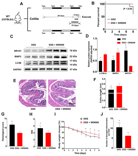 SR9009 alleviates symptoms. (A) Schematic representation of the colitis mouse model. (B) Survival rate of mice subjected to DSS-induced colitis and treatment with SR9009. (C,D) Protein expression levels of NR1D1, BNIP3, and LC3B-II in intestinal epithelial cells (IECs). (E) Histological evaluation of colon tissue, scale bar = 50 μm. (F–I) Comparisons of colon length, histological scores, DAI scores, and body weight loss among the experimental groups. (J) Quantification of damaged mitochondria in IECs. Data are presented as means ± standard deviations (n = 3–6). * p < 0.05 (Student’s t-test).