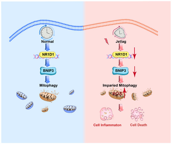 In this investigation, we examined the influence of NR1D1 on mitophagy in IECs amidst the context of UC. We engineered mouse models simulating both jet lag and colitis, enabling the observation of alterations in the expression dynamics of clock genes within IECs, specifically the notable downregulation of NR1D1. In vivo evidence revealed that the absence of NR1D1 aggravated the severity of DSS-induced colitis, establishing NR1D1 as a pivotal nexus between circadian rhythms and UC manifestation. UC is often characterized by persistent inflammation and IEC damage [36], with mitochondria playing a crucial role in regulating IEC homeostasis [10]. Through transmission electron microscopy, we observed an elevated quantity of damaged mitochondria within IECs. NR1D1 functions as a transcriptional activator, binding to BNIP3’s promoter region and driving its transcription. Consequently, a reduction in NR1D1 expression triggers a decrease in BNIP3 expression, thereby impeding mitophagy, exacerbating inflammation, and accelerating cell apoptosis within IECs (Figure 10).