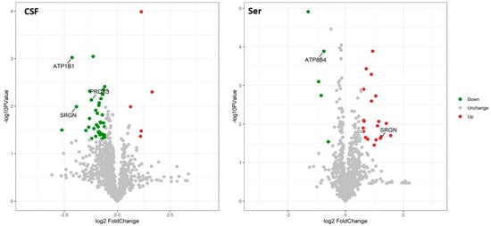 A total of 22 CSF samples (12 AD and 10 NC) and 60 serum samples (30 AD and 30 NC) were analyzed using a DIA-MS approach. Among the revealed 8321 precursors, 7670 peptides, and 1308 proteins (Supplementary Materials Table S1) in the CSF samples, the levels of 68 proteins were significantly different between the two groups. In the AD group, the levels of eight proteins—HV316 (gene name: IGHV3-16), PDCD5 (PDCD5), H2B1K (H2BC12), CAH11 (CA11), ACBP (DBI), CH60 (HSPD1), PPIC (PPIC), and MFAP5 (MFAP5)] were elevated, while 60 proteins [the top nine being: MYP2 (PMP2), AT1B1 (ATP1B1), TPM3 (TPM3), LIGO3 (LIGO3), SRGN (SRGN), MCP (CD46), PRDX3 (PRDX3), CAZA2 (CAPZA2), and ZNF84 (ZNF84)—were downregulated compared with the NC group. Among the revealed 8564 precursors, 7597 peptides, and 968 proteins (Supplementary Materials Table S2) in the serum samples, 65 DEPs were identified between the two groups. In the AD group, the levels of 55 proteins [the top nine being KVD13 (IGKV1D-13), FITM1 (FITM1), B3AT (SLC4A1), IGD, SRGN (SRGN), GTR1 (SLC2A1), STOM (STOM), K2C72 (KRT72), and EFCB6 (EFCAB6)] were upregulated, while the levels of 10 proteins were downregulated [LV151 (IGLV1-51), IGHM (IGHM), ALBU (ALB), OTUD4 (OTUD4), AT8B4 (ATP8B4), PHX2B (PHOX2B), FHR5 (CFHR5), CBLN4 (CBLN4), RBX2 (RNF7), and TEN1 (TENM1)] compared with the NC group. The volcano plots of these proteins are shown in Figure 1. The top nine upregulated and downregulated proteins are shown in Table 2 (CSF) and Table 3 (serum), as well as Figure 2 and Figure 3. It is worth noting that serglycin (SRGN) was markedly downregulated in AD CSF but upregulated in AD serum.