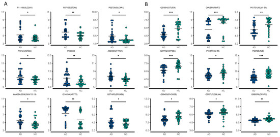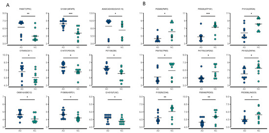 First nine upregulated (A) and downregulated (B) differentially expressed proteins in the serum from AD patients compared with the controls. * p < 0.05, ** p < 0.01, *** p < 0.001.