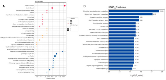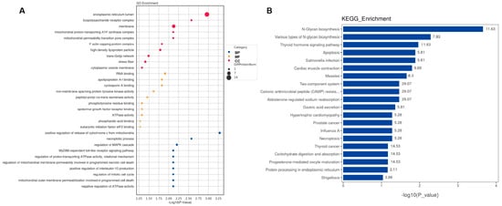 GO enrichment and KEGG pathway analyses were conducted to investigate the DEPs at the functional level. The top 10 GO biological processes, cellular components, and molecular functions (Figure 4A and Figure 5A) and the top 20 KEGG pathways (Figure 4B and Figure 5B) for CSF and serum DEPs were selected according to the number and significance of gene enrichment. The most enriched GO terms of the DEPs included ATPase-associated activity for CSF and mitochondrial functions for CSF, and serum were the most enriched GO terms of the DEPs. The N-Glycan biosynthesis pathways were the most significant KEGG pathways of the CSF DEPs.