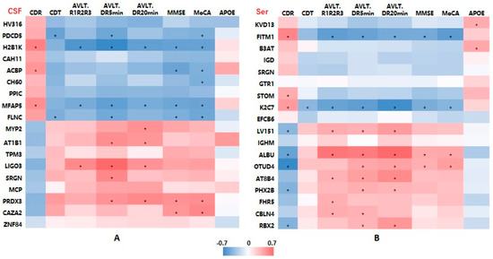 Heatmaps showing correlations between differentially expressed protein levels and clinical characteristics of AD patients. (A) CSF samples. (B) Serum samples. Abbreviations: AD, Alzheimer’s disease; MMSE, Mini-Mental State Examination; MoCA, Montreal Cognitive Assessment; CDR, Clinical Dementia Rating; CDT, clock drawing test; AVLT, Auditory-Verbal Learning Test, AVLT R1R2R3: mean score of three times of AVLT immediate recall; DR, delayed recall. Red means positive correlation, and blue means negative correlation; * p < 0.05.