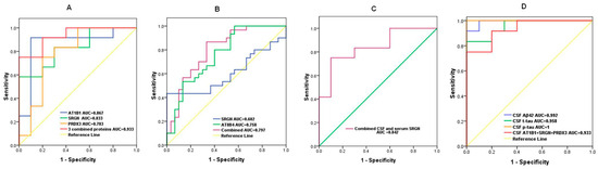 ROC curves showing the discriminative efficiency of selected DEPs to classify AD from controls. (A) AUC for CSF AT1B1, SRGN, PRDX3 levels and AT1B1 + SRGN + PRDX3; (B) AUC for serum AT8B4, SRGN, and AT8B4 + SRGN; (C) AUC for CSF SRGN+ serum SRGN. (D) AUC for CSF Aβ42, t-tau, p-tau, and AT1B1 + SRGN + PRDX3; ROC, receiver operating characteristic; DEPs, differentially expressed proteins; AUC, area under the curve.