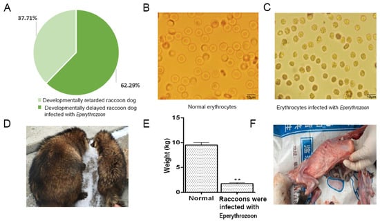 Clinical symptoms of raccoons with growth disorders. (A) Percentage of raccoons infected with Eperythrozoon. (B) Normal erythrocytes. (C) Erythrocytes infected with Eperythrozoon. (D) The weight and body size of the diseased raccoon dog are much smaller than those of the normal raccoon dog. The picture on the right shows a diseased raccoon dog. On the left is a normal raccoon dog. (E) Weight of a sick raccoon compared to a normal raccoon dog. Two asterisks denote significance (p < 0.01). (F) The sick raccoon dog has less subcutaneous fat.