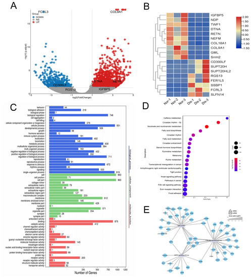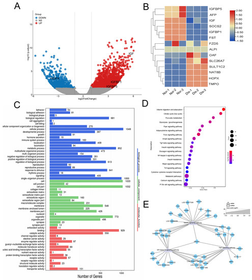 Expression analysis and functional prediction of differential mRNAs in the liver. (A) Volcano diagrams of mRNA. The abscissa and ordinate represent X = log2 (fold changes) and Y = −log10 (p-value), the red dots indicate upregulated differential genes, the blue dots indicate downregulated differential genes, and the gray dots represent genes with no significant difference. (B) The clustering heatmaps of the highest differentially expressed genes. Nor: Normal raccoon dog, Dis: Diseased raccoon dog. (C) GO analysis on the function of differential genes. (D) KEGG analysis of the top 20 signaling pathways enriched with differential genes. (E) Construction of an interplay network of PI3K-Akt signaling pathway, Tight junction, AMPK signaling pathway, and related genes aimed at obtaining key genes, and the results revealed that IGF1R, CREB3L1, TNS1, TENC1, and mTOR could participate in the three signaling pathways simultaneously.