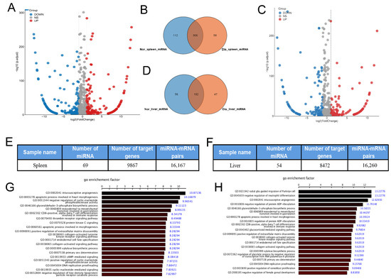 Expression analysis and function prediction of differential miRNAs. (A) Volcano diagrams of miRNA in the spleen; the red dots indicate up-regulated genes, the blue dots indicate down-regulated genes, and the gray dots indicate genes with no significant difference. (B) The distribution of differential miRNAs in the spleens of diseased and normal raccoons. The results showed that 306 miRNAs were common to both raccoons, while 58 miRNAs were specific for the diseased raccoon and 112 miRNAs were specific for the normal raccoon. Nor: Normal raccoon dog, Dis: Diseased raccoon dog. (C) Volcano diagrams of miRNA in the liver. The red dots indicate up-regulated genes, the blue dots indicate down-regulated genes, and the gray dots indicate genes with no significant difference. (D) The distribution of differential miRNAs in the spleens. The results showed that 192 miRNAs were common to both raccoons, while 47 miRNAs were specific for the diseased raccoon and 56 miRNAs were specific for the normal raccoon. (E) Results of miRNA and target gene count in the spleen. The results found 16,167 miRNA–mRNA pairs. (F) Results of the number of miRNAs and target genes in the liver. The results found 16,206 miRNA–mRNA pairs (G) GO analysis of the function of target genes of miRNAs in the spleen. (H) GO analysis of the function of target genes of miRNAs in the liver.