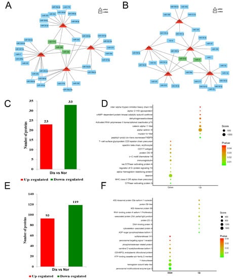 Construction of miRNA–mRNA regulatory network and differential protein analysis. (A) Construction of a network map of mRNA-miRNA in the spleen. The results showed miR-1268, miR-125b, and miR-1777a as central miRNAs regulating ERLIN1, JUN, and FOS genes. (B) Construction of a network map of mRNA-miRNA in the liver. It was found that miR-10-5p and miR-10 as central miRNAs regulate the expression of IGF1R, CREB3L1, TNS1, mTOR genes. (C) The number of differential proteins in the spleen was counted, of which 23 proteins were up-regulated and 33 proteins were down-regulated. (D) In the spleen, the top twenty most significantly differential proteins are shown. (E) A number of differential proteins are counted in the liver, of which 93 proteins are upregulated and 119 proteins are downregulated. Nor: Normal raccoon dog, Dis: Diseased raccoon dog. (F) In the liver, the top twenty proteins with the most significant differences are displayed.