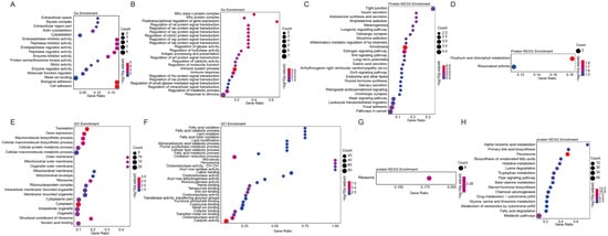 GO and KEGG analysis of the function of differential proteins. (A) GO analysis of the function of up-regulated proteins in the spleen. (B) GO analysis of the function of down-regulated proteins in the spleen. (C,D) KEGG analysis of the up-regulated and down-regulated protein enrichment signaling pathways in the spleen. (E) GO analysis of the function of up-regulated proteins in the liver. (F) GO analysis of the function of down-regulated proteins in the liver. (G,H) KEGG analysis of the signaling pathway of up-regulated and down-regulated protein enrichment in the liver.