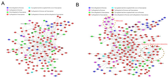 Constructing gene–protein interaction networks based on transcriptomic proteomic association analysis. (A) Construction of a differential gene and differential protein inter-regulatory network in the spleen. (B) Construction of a differential gene and differential protein regulatory network in the liver.