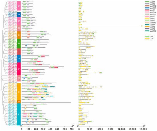 To further research the phylogenetic connections among HpbZIP TFs, an unrooted phylogenetic tree containing only HpbZIPs was made, and the exon–intron structure and allocations of conserved domains in HpbZIPs were analyzed (Figure 2). The HpbZIPs were classified and named as above. The results of multiple sequence alignment forecasted that every HpbZIP had a conserved bZIP domain, and its N-terminal region was an alkaline region containing an N-X7-R/K motif, as well as its C-terminal leucine zipper region containing leucine every seven hydrophobic amino acids. The exon–intron structures of HpbZIPs between members are shown in Figure 2. The genetic structures suggested significant specificity between groups. Because the same subtribe in introns and exons is relatively similar, the distribution and quantity of splice sites were fairly conservative, the same subtribe genes had closer evolutionary relationships. Some HpbZIP genes (28%) were intronless. Six genes only had CDS sequences: HpbZIP18, HpbZIP13, HpbZIP53, HpbZIP63, HpbZIP15, and HpbZIP68. The number of exons was 12 at most and 1 at least. The number of introns was 11 at most and 1 at least. Compared with other genes in the bZIP gene family, the length of HpbZIP46 was the largest, at about 5–6 times the average length of other genes, with very long introns and very short CDS sequences. There were seven groups (HpbZIP6/HpbZIP7, HpbZIP31/HpbZIP41, HpbZIP17/HpbZIP67, HpbZIP50/HpbZIP79, HpbZIP38/HpbZIP74, HpbZIP19/HpbZIP51, and HpbZIP57/HpbZIP62) that contained the same number of exons and of similar length, suggesting that there may be tandem repeats in the HpbZIP gene family.
