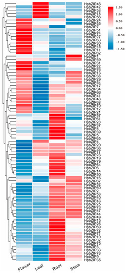 Expression profiles of HpbZIP genes: Hierarchical clustering of expression profiles of 79 HpbZIP genes in different tissues (root, stem, leaf, and flower).