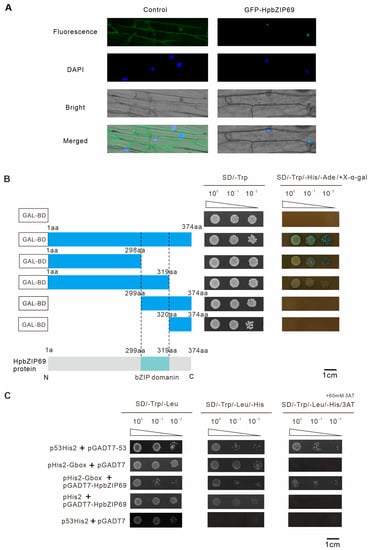 According to the evolutionary relationship, HpbZIP69 is homologous to ABF3 (AtbZIP37) and ABF4/AREB2 (AtbZIP38) [18,31], which are involved in the regulation of abiotic stresses such as drought. It is speculated that HpbZIP69 also has a similar function. Meanwhile, combined with the analysis of gene expression patterns under drought treatment, the expression level of HpbZIP69 was also significantly increased. The full length of HpbZIP69 cDNA is 1125 bp, encoding 374 amino acids, with a molecular weight of 40.28 KDa and an IP of 9.4. Bioinformatics software analysis showed that HpbZIP69 was mainly localized in the nucleus (Supplementary Figure S5), which is consistent with the general characteristics of transcription factors. To verify the localization of HpbZIP69, the HpbZIP69 was fused with GFP driven by the 35S promoter and transiently expressed in onion epidermal cells. The HpbZIP69-GFP was detected in the nucleus (Figure 5A), indicating that HpbZIP69 is a nucleus-localized protein. As shown in Figure 5B, the N-terminal region (1-298 aa) without the bZIP domain had minimal demand for its trans activity, as bZIP transcription factors bound the G-box motif (CACGTG). The yeast one-hybrid assay indeed showed that HpbZIP69 binds G-box with a conserved sequence (Figure 5C). The abovementioned results show that HpbZIP69 is a characteristic bZIP transcription factor.