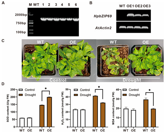 To investigate the function of HpbZIP69, pEarleyGate202-HpbZIP69 was transferred into Arabidopsis (Col-0). The target gene was amplified and identified to verify whether the transgenic plants were positive. HpbZIP69 was cloned from six candidate transgenic lines, but no bands were found at 1000–2000 bp in the WT (Figure 6A). Three independent stable homozygous lines were acquired. They were confirmed using semi-qRT-PCR (Figure 6B). According to the results of semi-qRT-PCR, the expression of HpbZIP69 was higher in OE-1 than in OE-2 and OE-3, so the OE-1 line was selected for subsequent functional assays. To see whether HpbZIP69 can enhance the drought resistance of plants, one-month-old field Arabidopsis seedlings were used for drought tolerance analysis. The growth development of the OE lines was obviously better than that of the WT without water for 15 days (Figure 6C). The contents of SOD in the OE lines were higher than that in the WT under drought treatment, and the MDA and H2O2 contents in the OE lines were notably lower than in the WT (Figure 6D). The aforementioned results revealed that the ectopic expression of HpbZIP69 enhanced the drought tolerance in Arabidopsis.