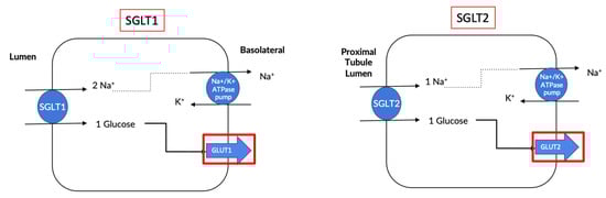 The entry of glucose into cells is regulated by facilitative glucose transporters (GLUTs) and sodium-dependent glucose cotransporters (SGLTs). Of the SGLT family, SGLT1 and SGLT2 are frequently investigated in a range of disease settings [16], as they play key roles in the transport of glucose and sodium across the brush-border membrane of intestinal and renal cells [17]. Although SGLT1 is less researched than SGLT2, it is more widely expressed throughout the body and is found predominantly in the small intestine [18,19,20] (Figure 1; Table 1), and it only accounts for 5–10% of the glucose reabsorption in the kidneys. Our studies have shown that heightened Sympathetic Nervous System (SNS) activity upregulates this SGLT1 expression, and therefore, inhibition of this protein could also be beneficial in treating cardiometabolic disorders [21]. SGLT2 is a high-capacity, low-affinity glucose cotransporter, mainly found in the S1 and S2 segments of the renal convoluted proximal tubules (Figure 1; Table 1), and it is required for the reabsorption of a majority of the glucose (~90–95%) filtered by the kidneys [22,23].