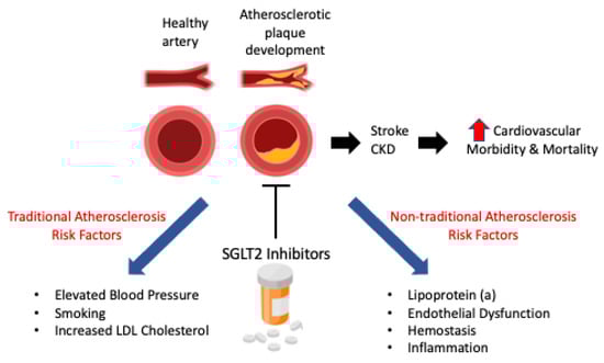 When it comes to cardiovascular and kidney disease, there are two main clinical trials evaluating the effectiveness of the SGLT2 inhibitor DAPA in people with diabetes. One major cause of Cardiovascular Disease is atherosclerosis, which may be caused by both traditional and nontraditional risk factors [4] (Figure 2). The Dapagliflozin Effect on Cardiovascular Events–Thrombolysis in Myocardial Infarction 58 (DELCARE-TIMI 58) trial [26] recruited people who had both diabetes and atherosclerotic Cardiovascular Disease, and although Dapagliflozin did not result in a higher or lower rate of Major Adverse Cardiovascular Events (MACE), it did lead to a lower rate of cardiovascular death or hospitalization for heart failure (4.9% vs. 5.8%) compared with placebo. In addition to this trial, the Dapagliflozin and Prevention of Adverse Outcomes in Chronic Kidney Disease (DAPA-CKD) study [57] found that not only did DAPA reduce the risk of a declining GFR level (5.2% vs. 9.3%), it decreased the risk of end-stage kidney disease (5.1% vs. 7.5%) and death from renal causes (<0.1% vs. 0.3%) versus controls.