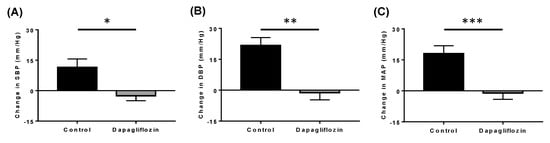 Studies have highlighted that SGLT2 inhibition promotes remarkable reductions in blood pressure. In our neurogenically hypertensive BPH/2J mice, treatment with DAPA significantly reduced systolic and diastolic blood pressure, as well as mean arterial pressure (Figure 3). This blood pressure reduction also correlated with a remarkable sympathoinhibitory effect in the kidneys [22].