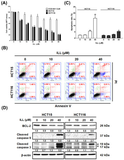 The cytotoxic effect of ILL on CRC cells was examined. Human HCT15 and HCT116 CRC cells with a normal human colon epithelial cell line, CCD 841 CoN, were incubated with different concentrations (10–40 μM) of ILL for 24 h. MTT assays revealed that the proliferation of CRC cells was significantly suppressed in a dose–dependent manner after ILL treatment (Figure 1A and Figure S1). The IC50 levels for HCT15 and HCT116 at 24 h were 22.1 ± 0.3 and 22.4 ± 0.1 μM, respectively. However, the viability of CCD 841 CoN cells decreased by only 20%, suggesting that ILL–induced cytotoxicity was selective for malignant rather than normal colorectal epithelial cells. To explore whether ILL inhibited the proliferation of CRC cells by inducing apoptosis, apoptotic cells were detected by annexinV–PI staining, followed by a flow cytometry analysis (Figure 1B). Treatment with increasing concentrations of ILL significantly increased the percentage of apoptotic cells in a dose–dependent manner. The percentage of apoptotic cells after 40 μM of ILL treatment was increased by 15.9 ± 6.7% (HCT15) and 5.4 ± 1.6% (HCT116) compared to the control group (Figure 1C). In addition, ILL treatment increased the levels of apoptosis–related proteins such as cleaved caspase–9 and –3 in CRC cells (Figure 1D). Taken together, these results suggest that ILL treatment inhibits cell proliferation and induces apoptosis in human CRC cells.