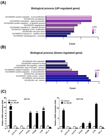 Effects of ILL on human CRC cells. Cells were treated with 40 μM of ILL followed by RNA–seq analysis. The (A) up–regulated biological process and the (B) down–regulated biological process that were enriched after ILL –treatment are shown. (C) Cells were treated with 40 μM of ILL for 24 h, and the up–regulated genes related to autophagy induction and the down–regulated genes related to cell cycle progression were validated using real–time PCR. Data are presented as the mean ± SD from three different experiments. * p < 0.05 versus control, ** p < 0.01 versus control, and *** p < 0.001 versus control.