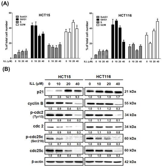ILL induces G2/M phase arrest in CRC cells. (A) Cells were treated with 0–40 μM of ILL for 24 h, and the cell cycle distributions were then analyzed by flow cytometry. Data are presented as the mean ± SD from three different experiments. * p < 0.05 versus control. (B) Cells were treated with 0–40 μM of ILL for 24 h, the expression levels of p21, cyclin B, p–cdc2 (Tyr15), cdc2, p–cdc25c (Ser216), and cdc25c were determined by Western blot analysis.