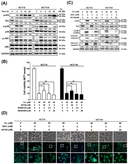The ROS–mediated signaling pathway involved in the ILL–induced autophagy and apoptosis of CRC cells. (A) Cells were treated with 40 μM of ILL for the indicated time points and the levels of p–ERK, ERK, p–JNK, JNK, p–p38, and p38 were determined by Western blot. (B) Cells were pretreated with 20 μM of ERK inhibitor (U0126), 2.5 μM of JNK inhibitor (SP600125), or 20 μM of p38 inhibitor (SB203580) for 2 h, followed by treatment with 40 μM of ILL for 24 h. They were then subjected to an MTT assay for cell viability analysis. Data are presented as the mean ± SD from three different experiments. * p < 0.05 versus control, ns: not significant. (C) Cells were pretreated with 3 mM of NAC or 20 μM of ERK inhibitor (U0126) for 2 h, followed by treatment with 40 μM of ILL for 24 h. The levels of p–ERK, ERK, LC3B–I, LC3B–II, and cleaved caspase–9 and –3 were analyzed by Western blot. (D) Cells were pretreated with 3 mM of NAC or 20 Μm of ERK inhibitor (U0126) for 2 h, followed by treatment with 40 μM of ILL for 24 h. Cells were then subjected to MDC staining and the images were captured by fluorescence microscope.