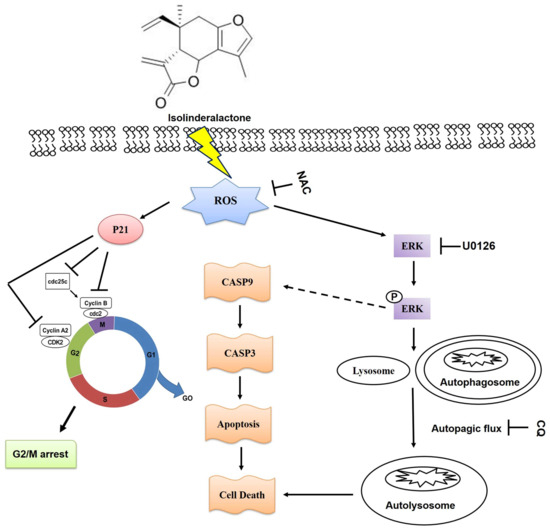 Isolinderalactone was purchased from AdooQ Bioscience (Purity > 98%, Irvine, CA, USA). Anti–β–actin antibody (A5316) and other chemicals were all purchased from Sigma Chemical Co., Ltd. (St. Louis, MO, USA). The antibodies utilized in this study, including anti–cleaved caspase–9 (#7237), anti–cleaved caspase–3 (#9661), anti–Bcl–2 (#4223), anti–p21 (#2947), anti–cyclin B1 (#12231), anti–p–cdc2 (#4539), anti–cdc2 (#77055), anti–p–cdc25c (#4901), anti–cdc25c (#4688), anti–LC3B (#2775), anti–p–ERK (#4370), anti–ERK (#4695), anti–p–p38 (#4511), anti–p38 (#8690), anti–p–JNK (#4668), anti–JNK (#9258), were all purchased from Cell Signaling Technology, Inc. (Danvers, MA, USA). Bradford protein assay kit was purchased from Bio–Rad (Hercules, CA, USA). PVDF membranes were purchased from Merck Millipore (Bedford, MA, USA). The Western blot chemiluminescence reagent was purchased from Amersham Biosciences (Arlington Heights, IL, USA).