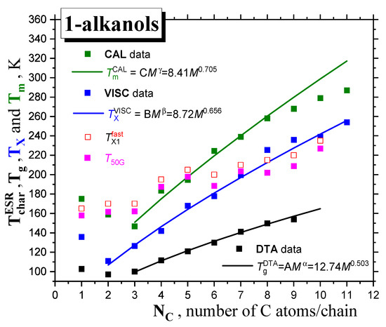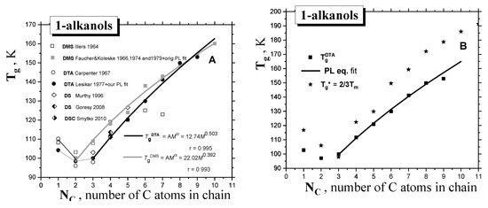 where A and α are empirical parameters of a given homologous series of compounds. As seen in Figure 1A, they exhibit similar trends depending relatively strongly on the method of generation of the amorphous material and the set up used in DMS or DTA, respectively. The latter values of Tg DTA coinciding with Tg CAL in cases of lower 1-alkanols, such as ethanol, 1−propanol and 1−butanol, as studied by the special CAL technique, i.e., quasi-adiabatic calorimetry (QADC) [17,28], are considered to be more reliable, mainly because of the experimental complexity of DMS.