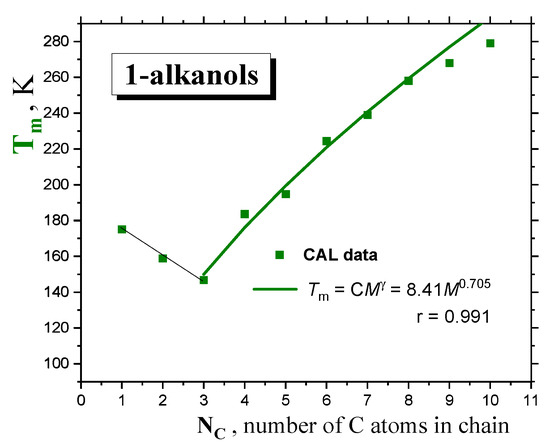 The melting temperature Tm of 1-alkanols as a function of the molecular size expressed by the number of C atoms in the chain, NC. Fit of the Tm’s from the CAL data set from Ref. [18] via the PL equation Tm = CM γ is included.