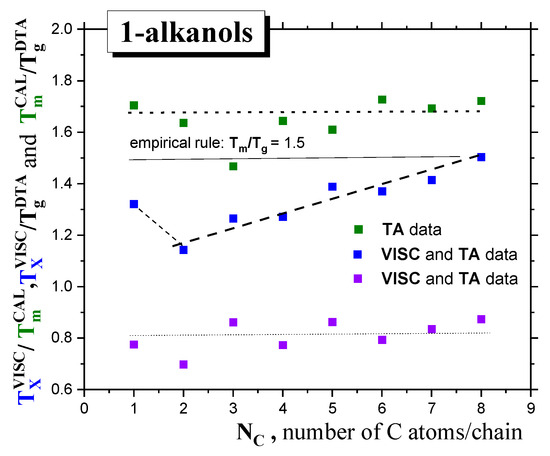 Finally, returning to Figure 3, a comparison of TX/Tg vs. Tm/Tg dependencies as a function of molecular size NC starting from C2OH shows a diametrically different trend for the former quantity with respect to the latter one, i.e., the increasing distance of the particular TX from the respective Tg with the increasing molecular size of 1−alkanol. This finding, together with the almost identical relative distance of TX from Tm (ca. 0.81 × Tm), indicates that the larger the molecule of 1−alkanol, the larger the temperature range of the strongly (or deeply) (and correspondingly, the shorter the weakly (slightly)) supercooled liquid state. On the other hand, upon cooling the smaller 1−alkanols, the weakly supercooled liquid state persists for longer, with a correspondingly shorter deeply supercooled liquid range.